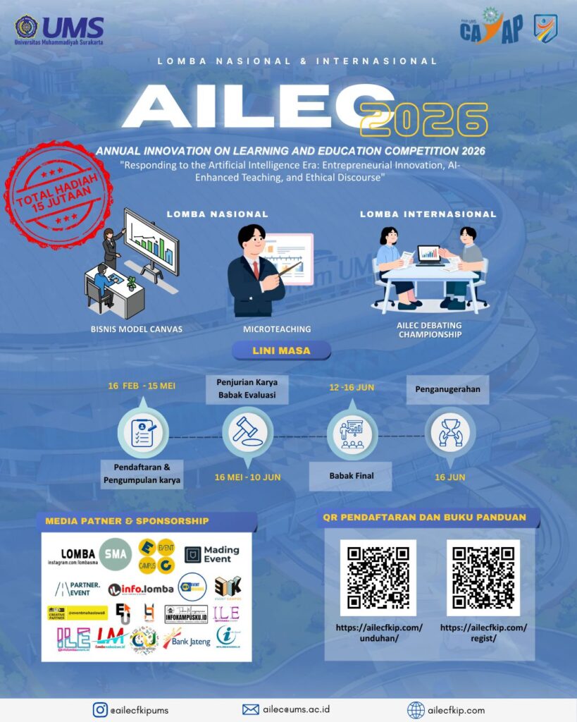 Fakultas Keguruan dan Ilmu Pendidikan Universitas Muhammadiyah Surakarta (FKIP UMS) sebagai salah satu lembaga pendidikan tenaga kependidikan di Indonesia merasa perlu mewadahi inovasi-inovasi pendidikan tersebut melalui sebuah kompetisi. FKIP UMS menyelenggarakan Annual Innovation on Learning and Education Competition (AILEC) bagi mahasiswa untuk pertama kalinya pada tahun 2022. Kegiatan ini diharapkan dapat terselenggara dengan baik setiap tahunnya. AILEC 2026 terdiri dari empat lingkup karya yang dikompetisikan, yaitu: